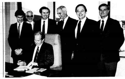 Seated: Don Ray, contracting officer, Western: standing (I-r ): Curt Loomis, senior account manager, Auto-trol; Tom Weaver, assistant administrator for engineering, Western; Bill Clagett, administrator, Western; Howard Hillman, president and chairman of the board, Auto-trol; Dave Weisberg, director of Federal Systems Group, Auto-trol; and Will Jacoby, chairman, technical evaluation panel, Western