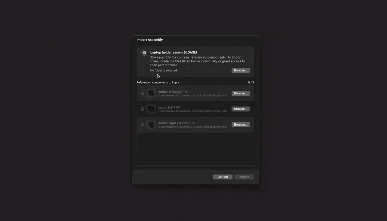 Now to load the linked part files of an assembly, you just need to select the originating folder when you import an SLDASM file.